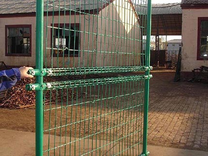 雙圈護欄網是用冷拔低碳鋼絲焊接成網筒狀卷邊與網面一體,采用鍍鋅進行防腐處理,具有很強的耐腐蝕性,然后進行噴、浸塑,各種顏色的噴、浸塑;最后連接附件與鋼管支柱固定。