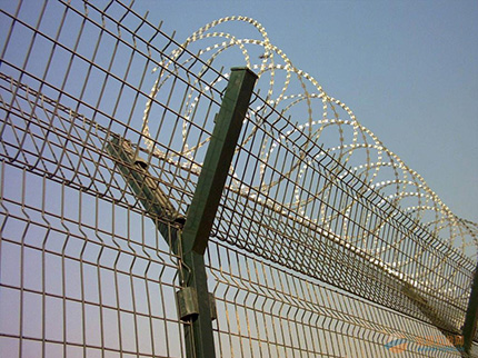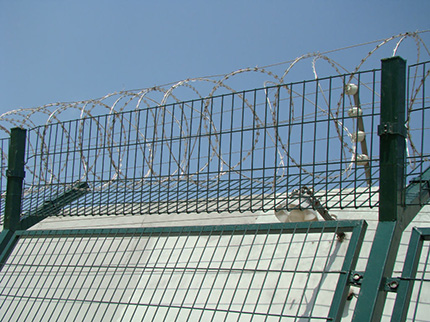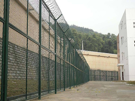 監(jiān)獄防護網(wǎng)主要是采用高強度的刀片刺網(wǎng)與普通防護網(wǎng)的結合,由V型支架立拄,加強型焊接片網(wǎng),安全防盜連接件和刀片刺網(wǎng)組成.刀片刺網(wǎng)是一種新型防護網(wǎng),由銳利尖角鍍鋅鋼板或不銹鋼薄板做刀片,鋼絲做芯線組合而成的防護器材。